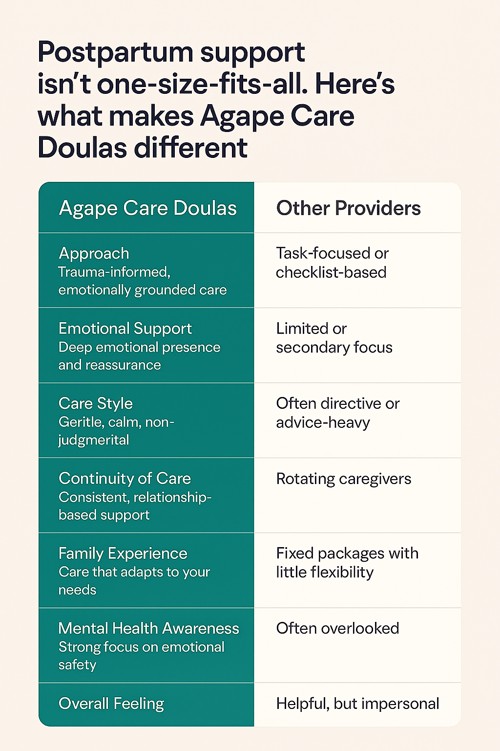 “All services are non‑medical and focus on emotional presence, practical support, and postpartum well‑being. They do not replace medical or therapeutic care.”